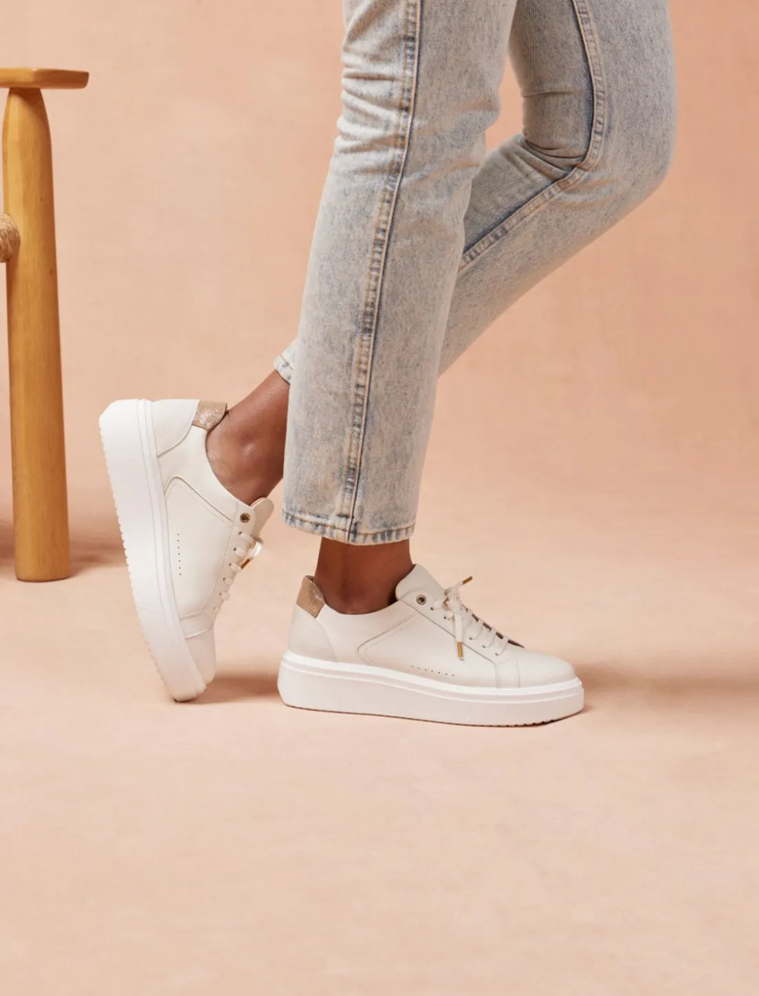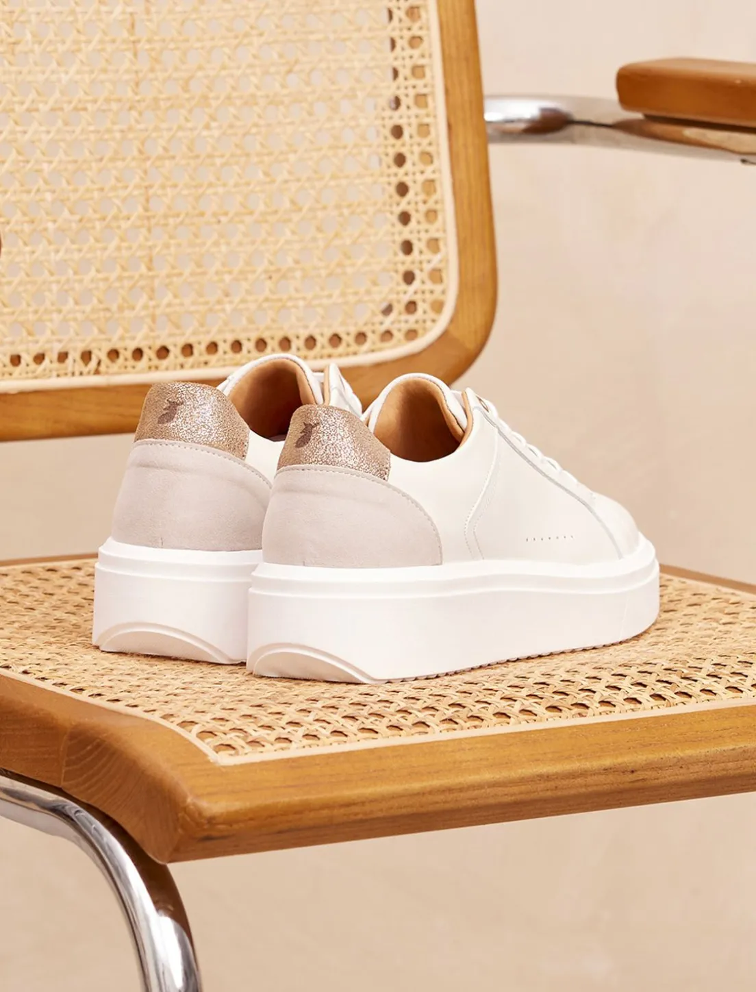 Découvrez Notre Nouveau Modèle De Sneakers Pour Femme : La Basket Chiara En Cuir Blanc Et Doré Avec Semelle Épaisse.