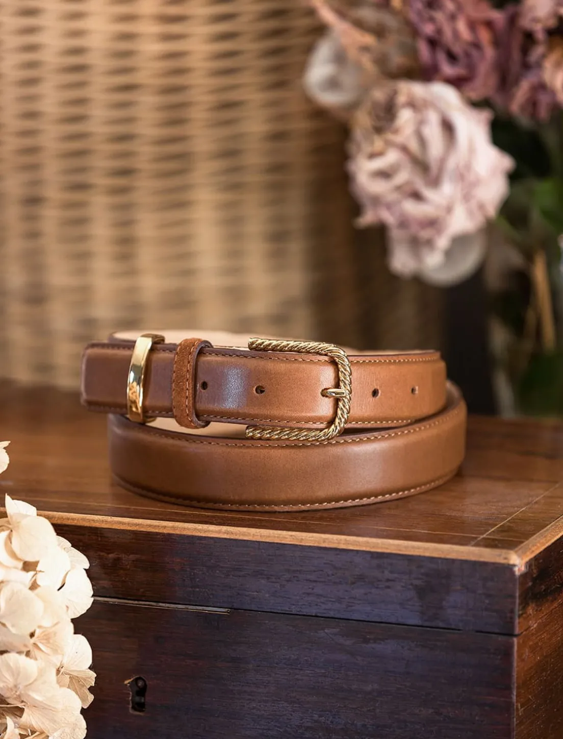 - Ceinture En Cuir Lisse Cognac Boucle Dorée