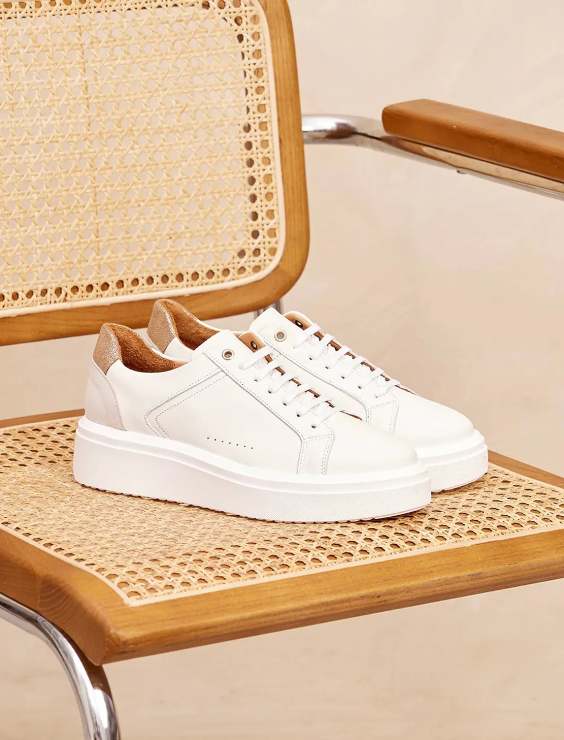 Découvrez Notre Nouveau Modèle De Sneakers Pour Femme : La Basket Chiara En Cuir Blanc Et Doré Avec Semelle Épaisse.