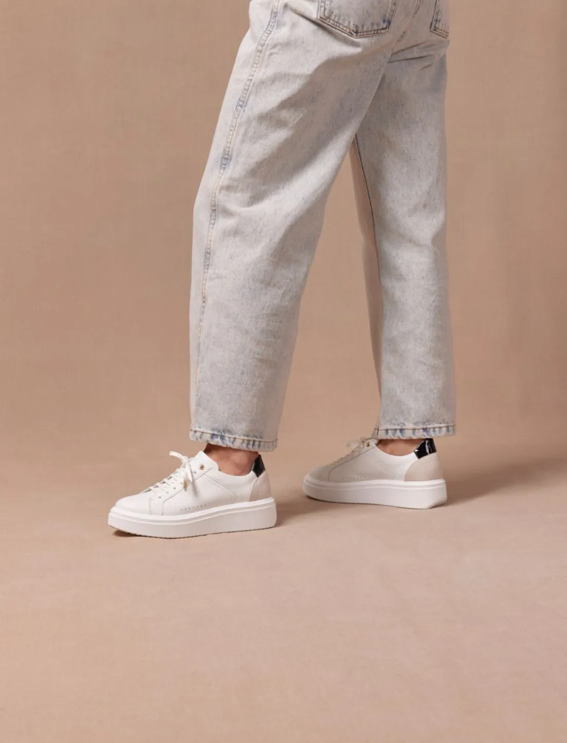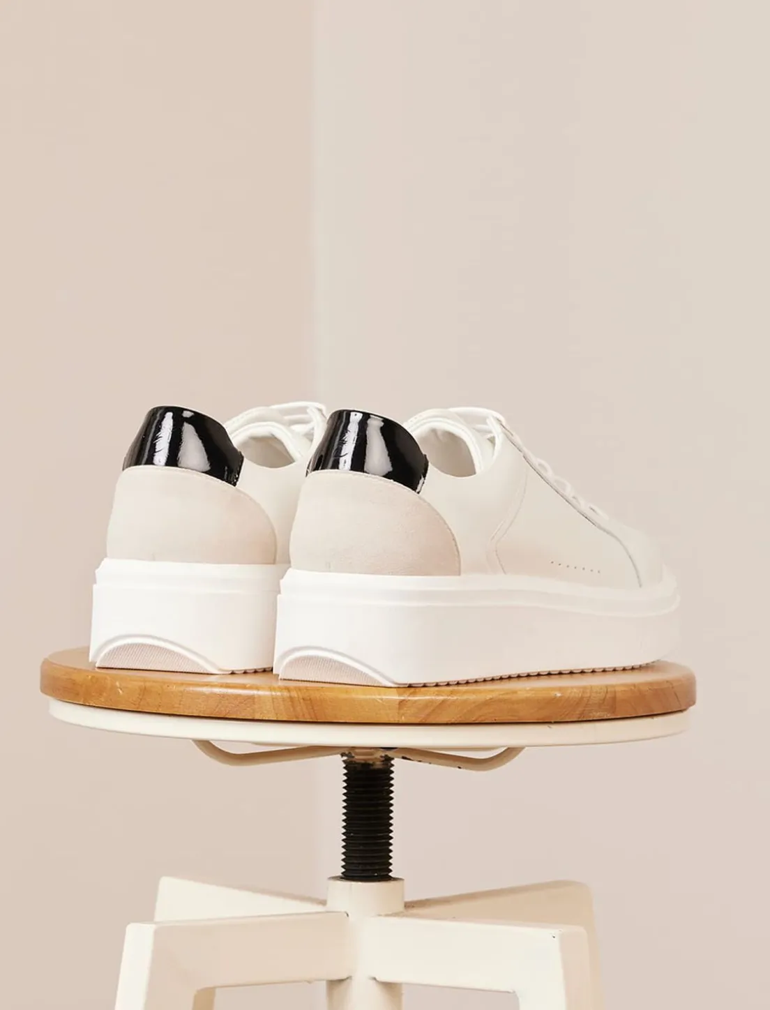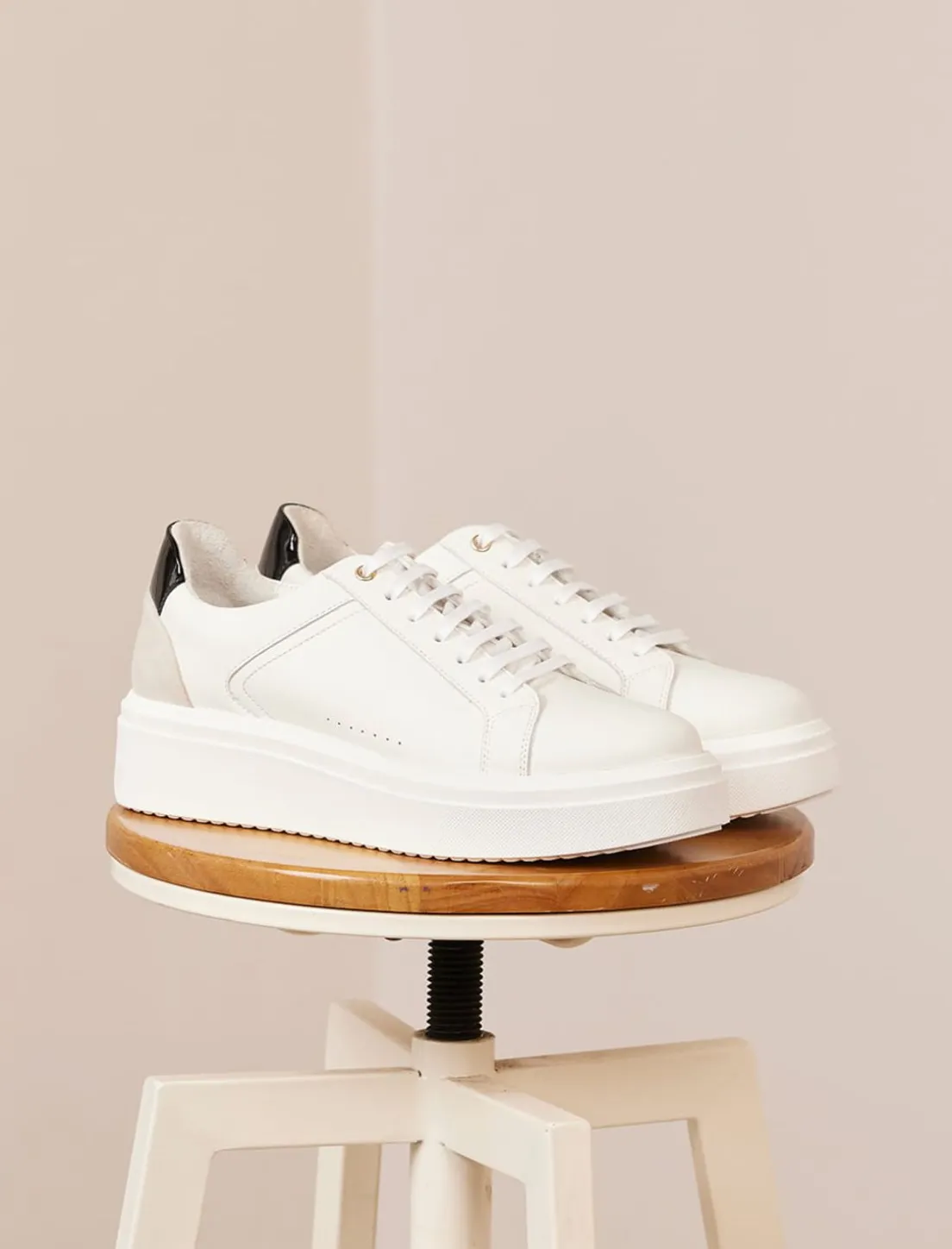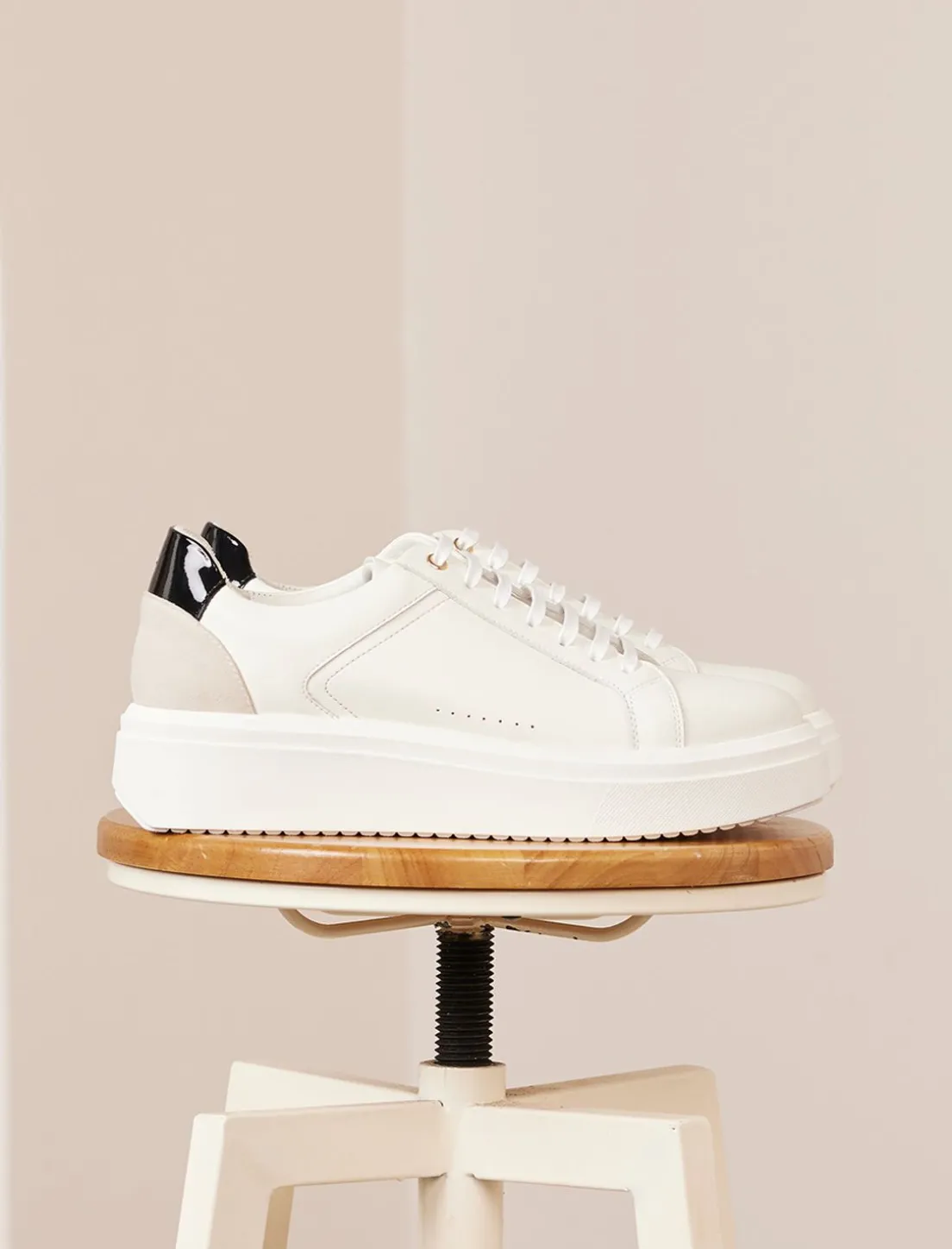 Découvrez Notre Nouveau Modèle De Sneakers Pour Femme : La Sneakers Chiara En Cuir Blanc Et Noir Avec Semelle Épaisse.